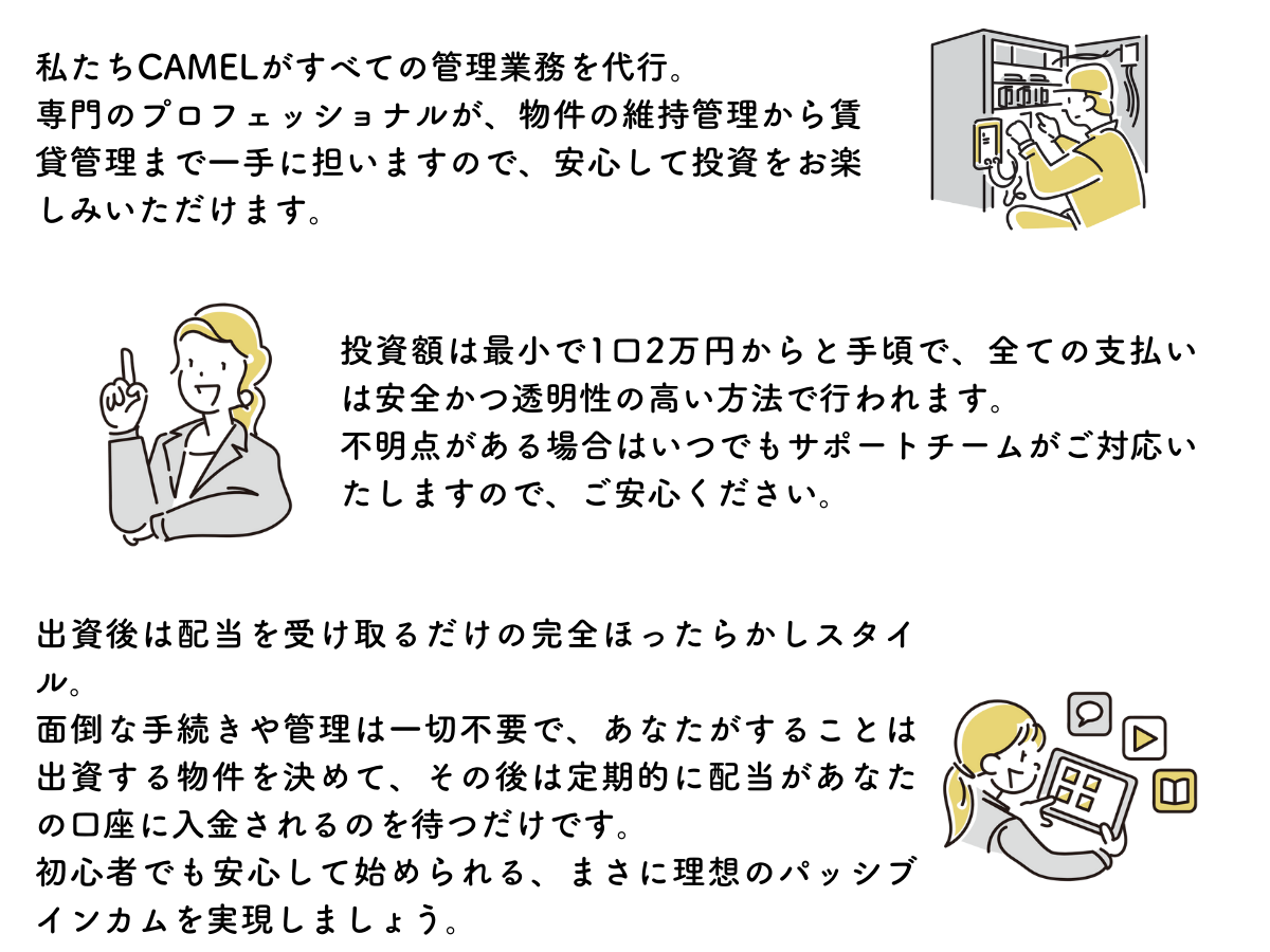 出資したら何もすることがないので簡単です。2万円から投資出来るのが私にとってはありがたいです。